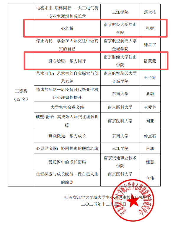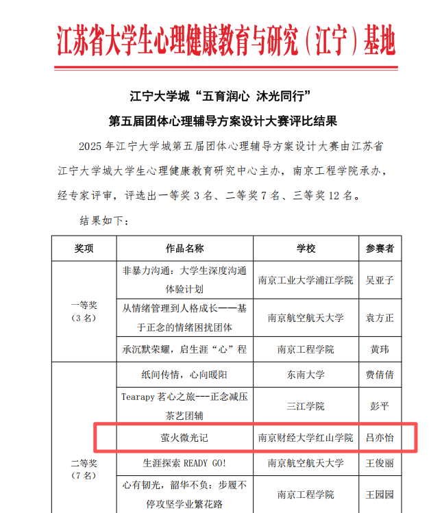 1月12日,江宁大学城“五育润心沐光同行”第五届团体心理辅导方案设计大赛结果揭晓。开云官网工商管理学院吕亦怡老师的作品《萤火微光记》荣获二等奖,法学院、外国语学院张媛老师及会计学院潘蒙蒙老师的作品《心之桥》《身心绘语,聚力同行》分获三等奖,充分展现了开云官网辅导员队伍的专业素养与心理育人能力。