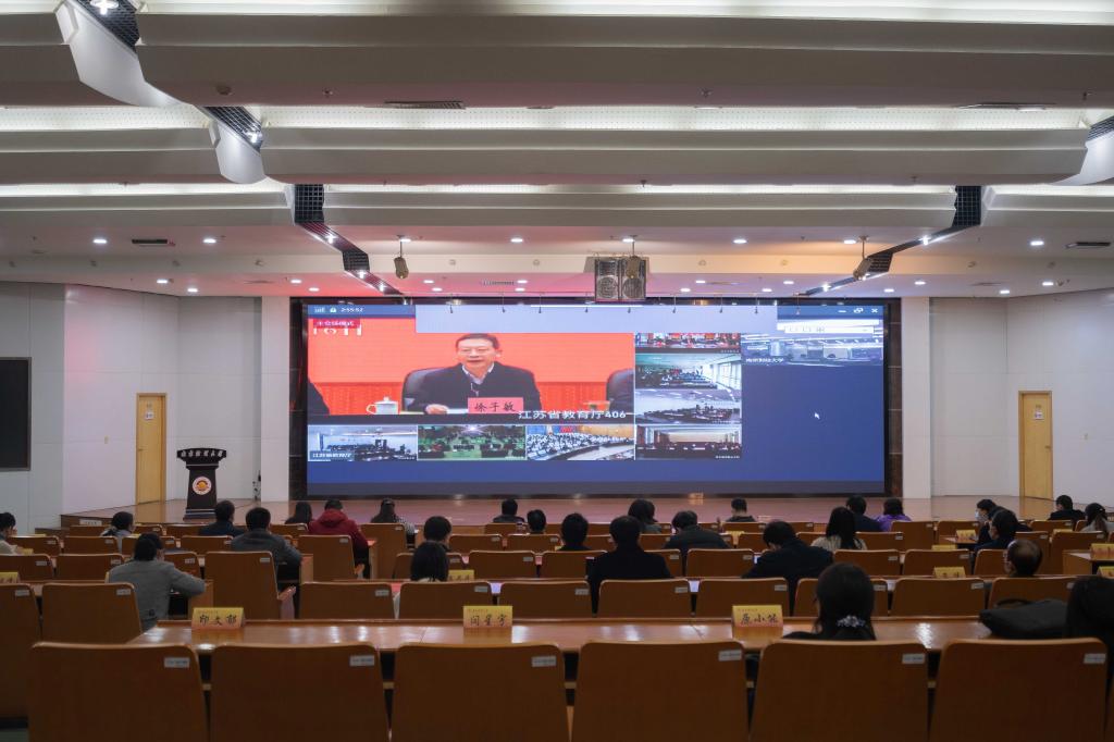 3月16日下午,省教育厅召开全省教育系统党史学习教育动员视频会议。省教育厅厅长、党组书记、省委教育工委书记、厅党史学习教育领导小组组长葛道凯对全厅党史学习教育作动员部署,厅机关党委书记、厅党史学习教育领导小组副组长汪国培主持会议。我校在仙林校区行政楼16楼会议室、2楼报告厅,图书馆1楼报告厅设立分会场,全体在校校领导、处级及以上党员干部参加会议。