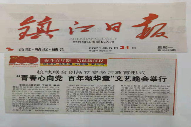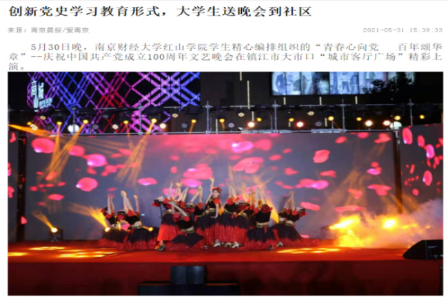 5月31日,多家媒体报道了红山学院与镇江市社科联、镇江市京口区委宣传部联合开展的党史学习教育特色工作——5月30日晚在镇江市城市客厅为镇江市民奉上的一场盛大的党史学习教育文化盛宴,“青春颂党章 永远跟党走”庆祝建党100周年文艺晚会燃爆城市客厅,众多市民前来观看,并举起手机拍照,现场气氛热烈,掌声不断,高潮迭起,点赞叫好声此起彼伏。