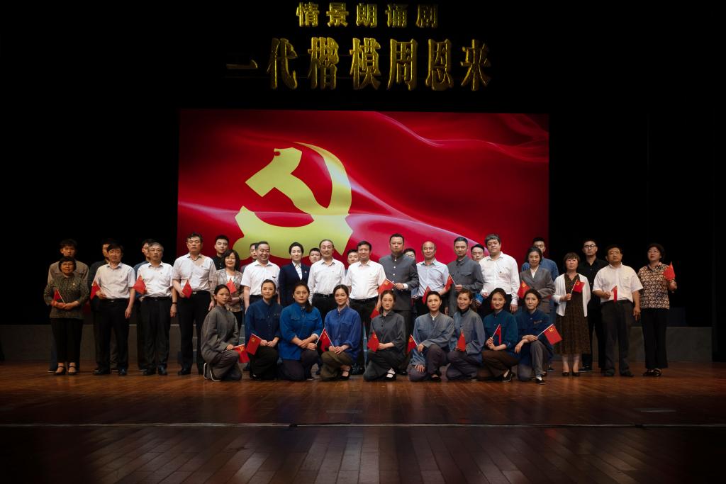 这部由江苏省文化和旅游厅和江苏省演艺集团有限公司联合打造的情景剧《一代楷模周恩来》,以诗歌、朗诵、讲述为主要表现形式,颂扬了一代伟人周恩来总理的革命精神和丰功伟绩。全剧大气磅礴而又深情细腻,分四个章节共15个情景。其中,诗歌《迎风讲话的周恩来》将周恩来总理百折不挠的意志深深地融进了铿锵有力的语句中;朗诵《平祖坟的故事》生动讲述了周恩来总理将周家墓地变为每年长出大片秧苗的沃土良田的故事;讲述《一条黄色棉被》见证了周恩来总理无数不眠之夜里的挑灯伏案;《一张午餐收据》再现了周恩来总理坐在工人食堂,津津有味地吃着炒豆腐和炒油麦菜的场景,日复一日。这些作品生动展现了周恩来总理讲严求实、严实相济的优良作风和精神品质,情真意切、直击心底,为现场师生带来了一堂生动的党史学习教育课。节目结束后,全场起立并挥舞着党旗,深情高歌《没有共产党就没有新中国》。