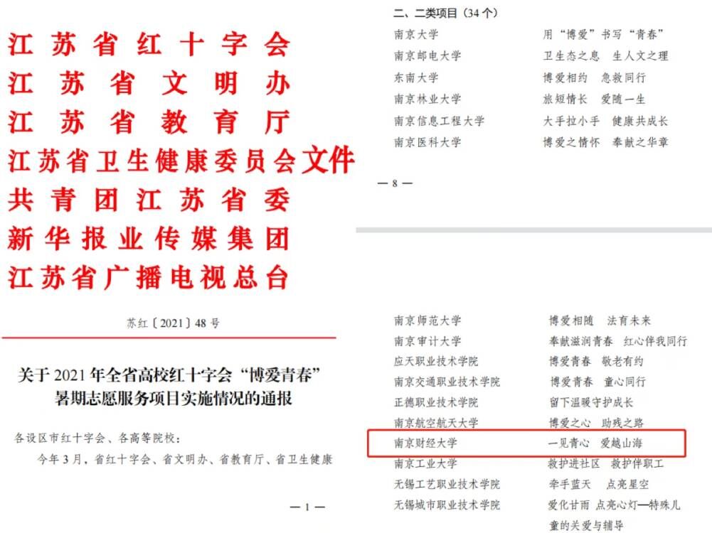 近日,江苏省红十字会等多部门联合开展的2021年江苏省高校红十字会“博爱青春”暑期志愿服务项目展示总结活动中,我校《一见青心,爱越山海》项目脱颖而出,入选省级支持项目,校团委副书记张蔚伟获评“优秀指导老师”,国贸2001班唐新月同学获评“优秀大学生志愿者”。