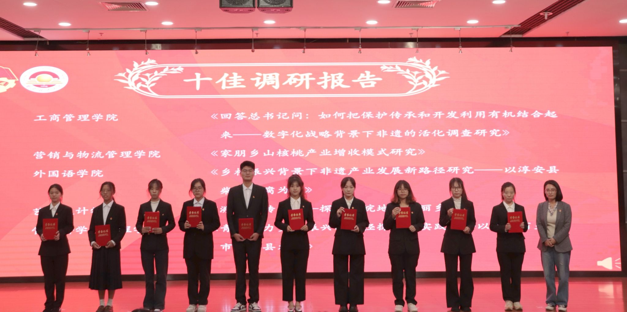 胡新蕲副书记宣读《关于表彰开云kaiyun官方网站2024年暑期文化科技卫生“三下乡”社会实践活动先进集体和先进个人的决定》。经济学院、财政与税务学院、金融学院、国际经贸学院、会计学院获评“先进单位”;营销与物流管理学院、艺术设计学院、信息工程学院、管理科学与工程学院、新闻学院获“宣传成果奖”;经济学院“粮心守丰年”暑期实践队等10支社会实践团队获评“十佳团队”;财政与税务学院冯涵等10名同学获评“十佳个人”;金融学院《从“文字下乡”到“数字下乡”:加快形成新质生产力背景下智慧化破局之道——基于三省六市智慧农业的发展调研研究》等10个调研报告获评“十佳调研报告”;会计学院王怡等10名同学获评“十佳通讯员”。