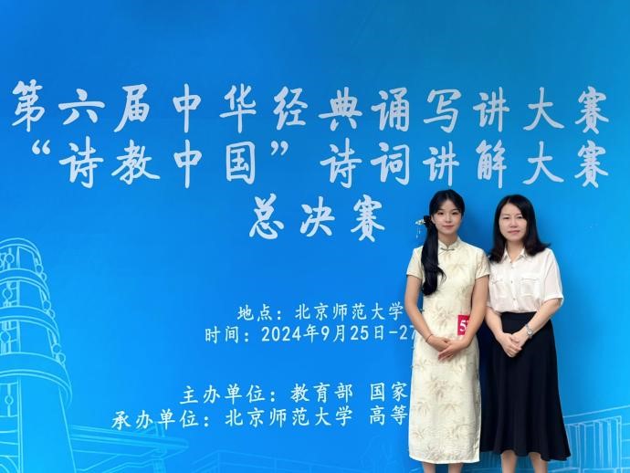 11月4日,第六届中华经典诵写讲大赛“诗教中国”诗词讲解大赛圆满落幕。我校新闻学院汉语言文学2201班高然同学获大学生组全国一等奖(最高奖),新闻学院汉语言文学2201班孙雨莎同学获大学生组全国优秀奖。